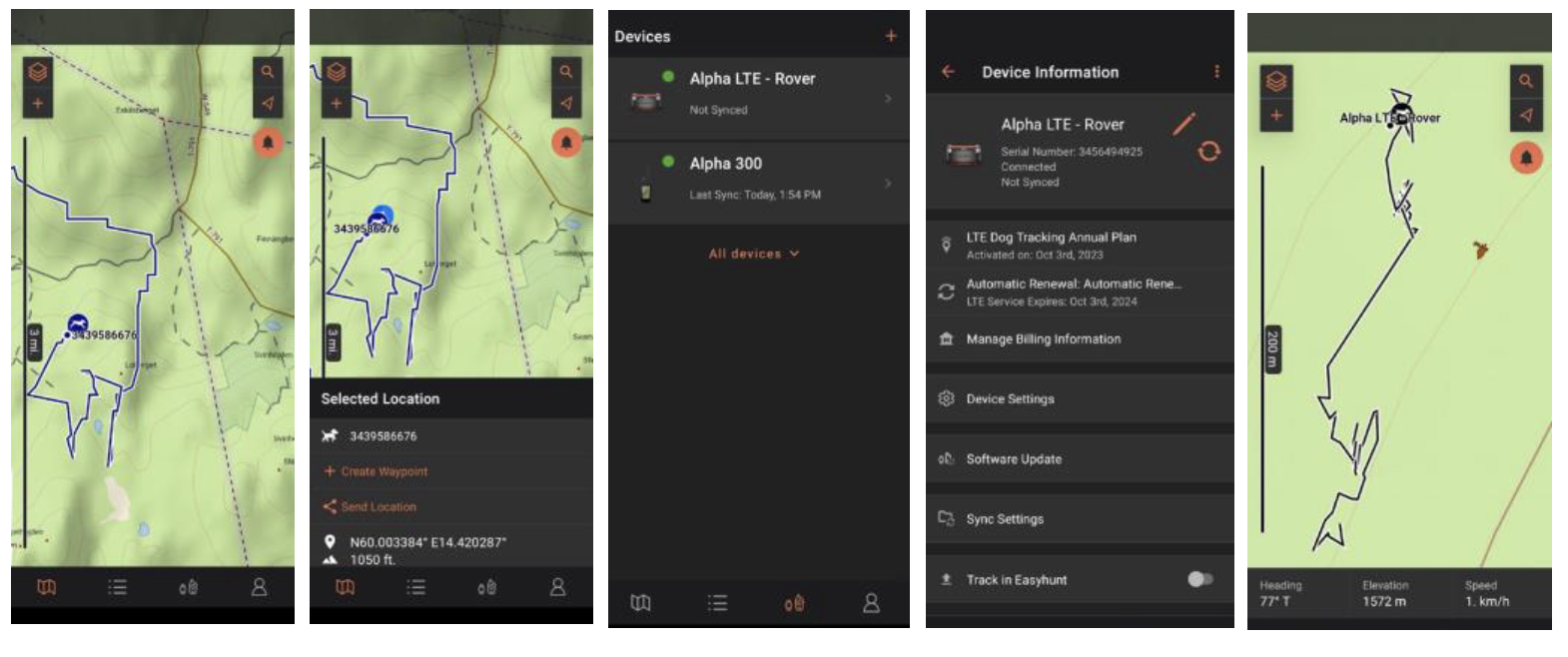 Verfolgen Sie die Bewegung des Hundes, markieren Sie Wegpunkte, navigieren Sie und vieles mehr während der Jagd - mit der Alpha-App, die auf einem kompatiblen Alpha-Handgerät und Smartphone installiert ist (Abonnement erforderlich) - Benutzerfreundlich: