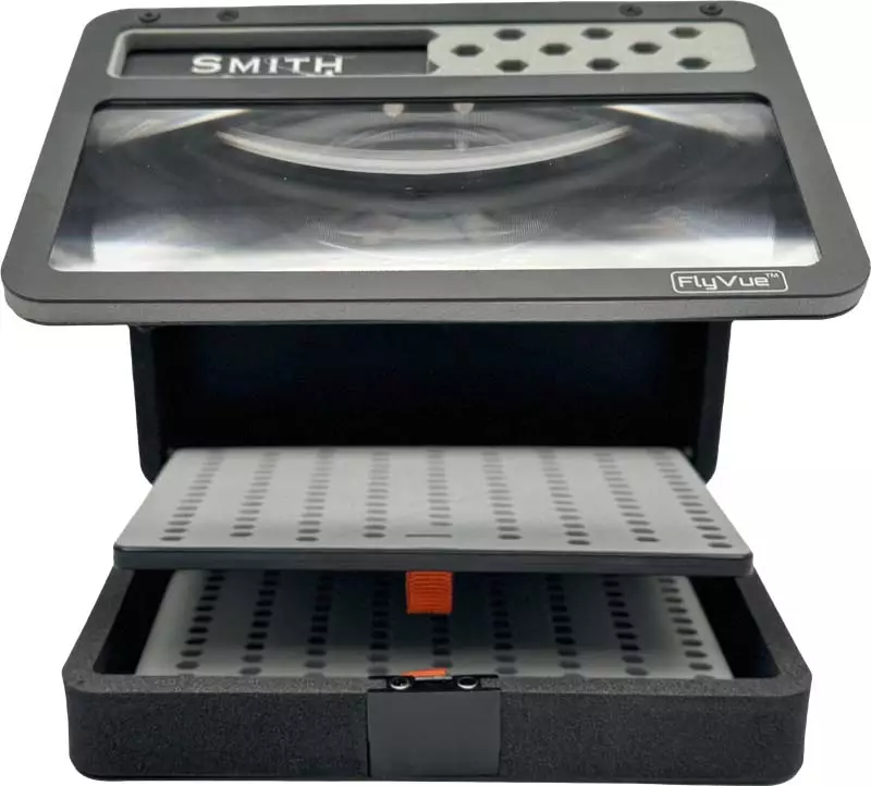Smith Creek FlyVue ist eine hochwertige Fliegenbox und Brustbefestigungssystem, das entwickelt wurde, um das Fliegenfischen zu erleichtern. Es verfügt über eine integrierte 3X Fresnel-Lupe, die beim Binden von dünnen Schnüren hilft.
