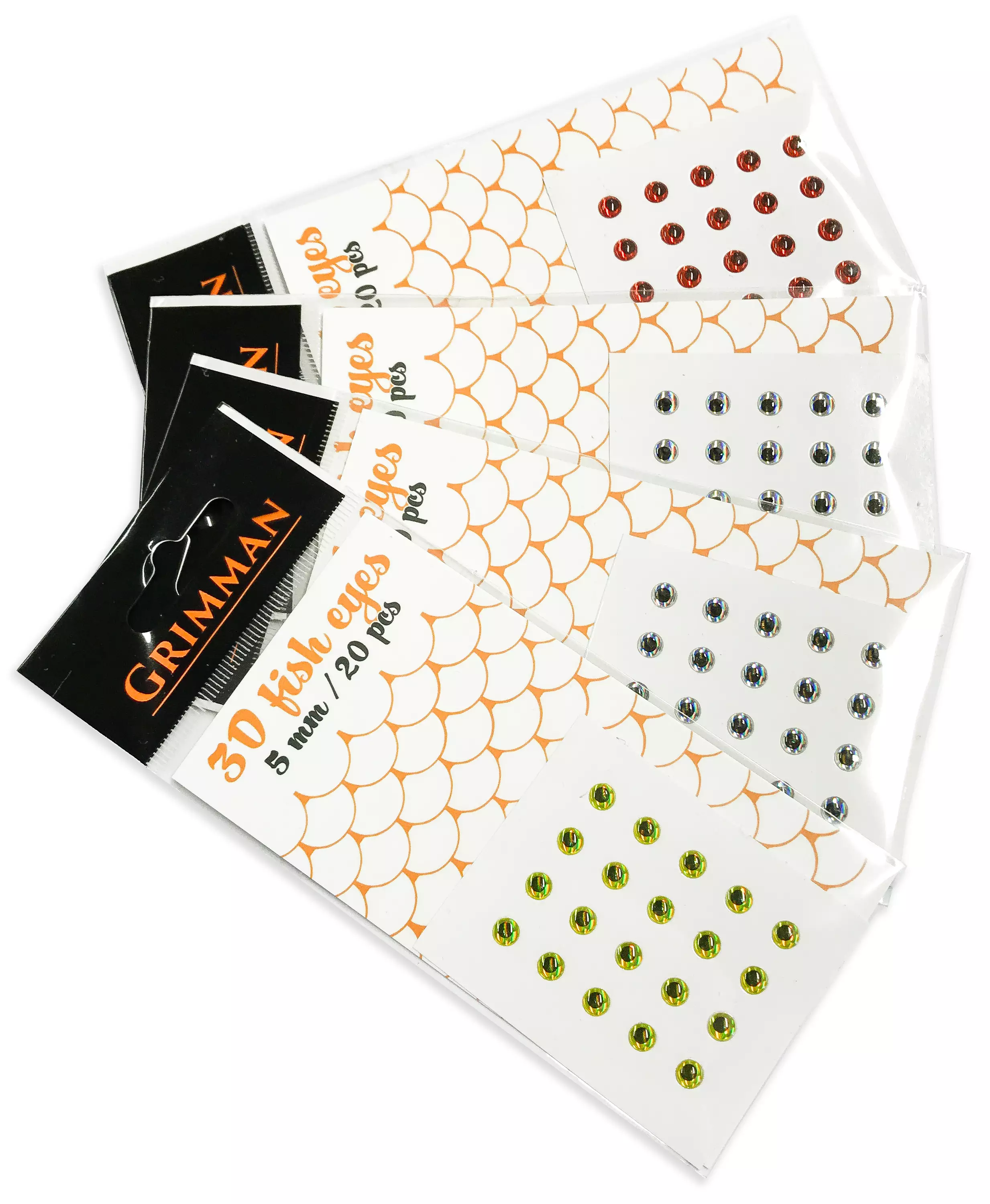Grimman 3D Fish Eye -Aufklebeaugen sind in sechs verschiedenen Größen erhältlich. Die Durchmesser der Größen betragen 3, 5, 6,5, 8, 10 und 12 Millimeter. Die Packung enthält 20 Aufklebeaugen. Dieses Produkt hat eine Größe von 5 mm.