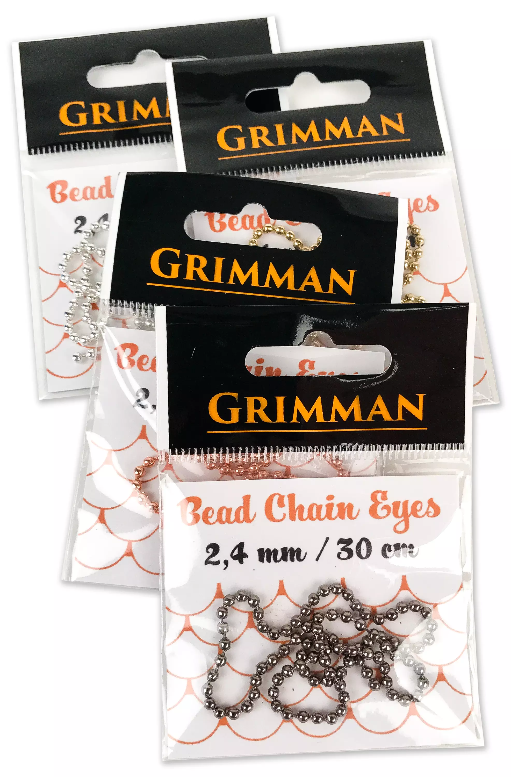 Grimman Bead Chain Eyes sind Grimman's Version der Kugelkette. Erhältlich sowohl in Metallfarben als auch in sehr leuchtenden, bemalten Fluorfarben. Von den drei verfügbaren Größen können Sie die für Ihren Verwendungszweck am besten geeignete auswählen. Die Packung enthält etwa 30 Zentimeter Kugelkette. Material: Messing.