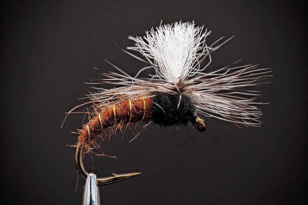 Klinkhamer Salmon Brown - Lachsoberflächenfliege ist eine speziell für das Lachsfischen entwickelte Trockenfliege. Diese Fliege ist bekannt für ihre Effektivität und wurde von Hans van Klinken entworfen. Der Klinkhamer kombiniert einen Fallschirmhechel mit einem unter der Wasseroberfläche hängenden Körper, was ihn besonders attraktiv für Fische macht. Dieses Modell ist auf einen hochwertigen Daiichi 1120 Haken gebunden, was seine Haltbarkeit und Zuverlässigkeit in Angelsituationen gewährleistet.