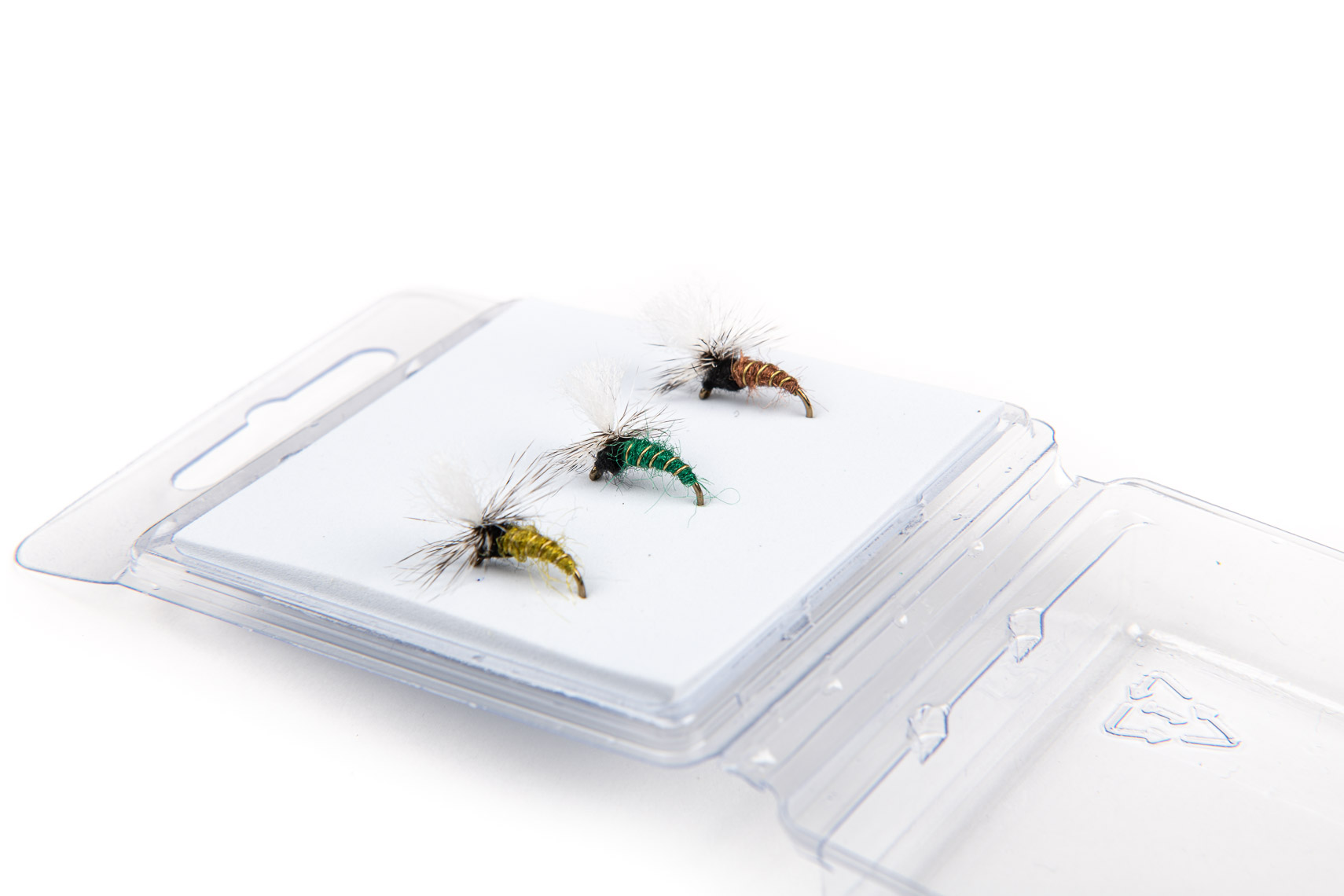 Klinkhamer Selection ist ein Trockenfliegen-Set, das drei beliebte Farben der Klinkhamer-Fliege enthält: Olive, Grün und Braun. Die Klinkhamer ist eine der bekanntesten Trockenfliegen, besonders für das Äschenfischen. Die Fliegen sind auf Haken der Größe #12 gebunden.
