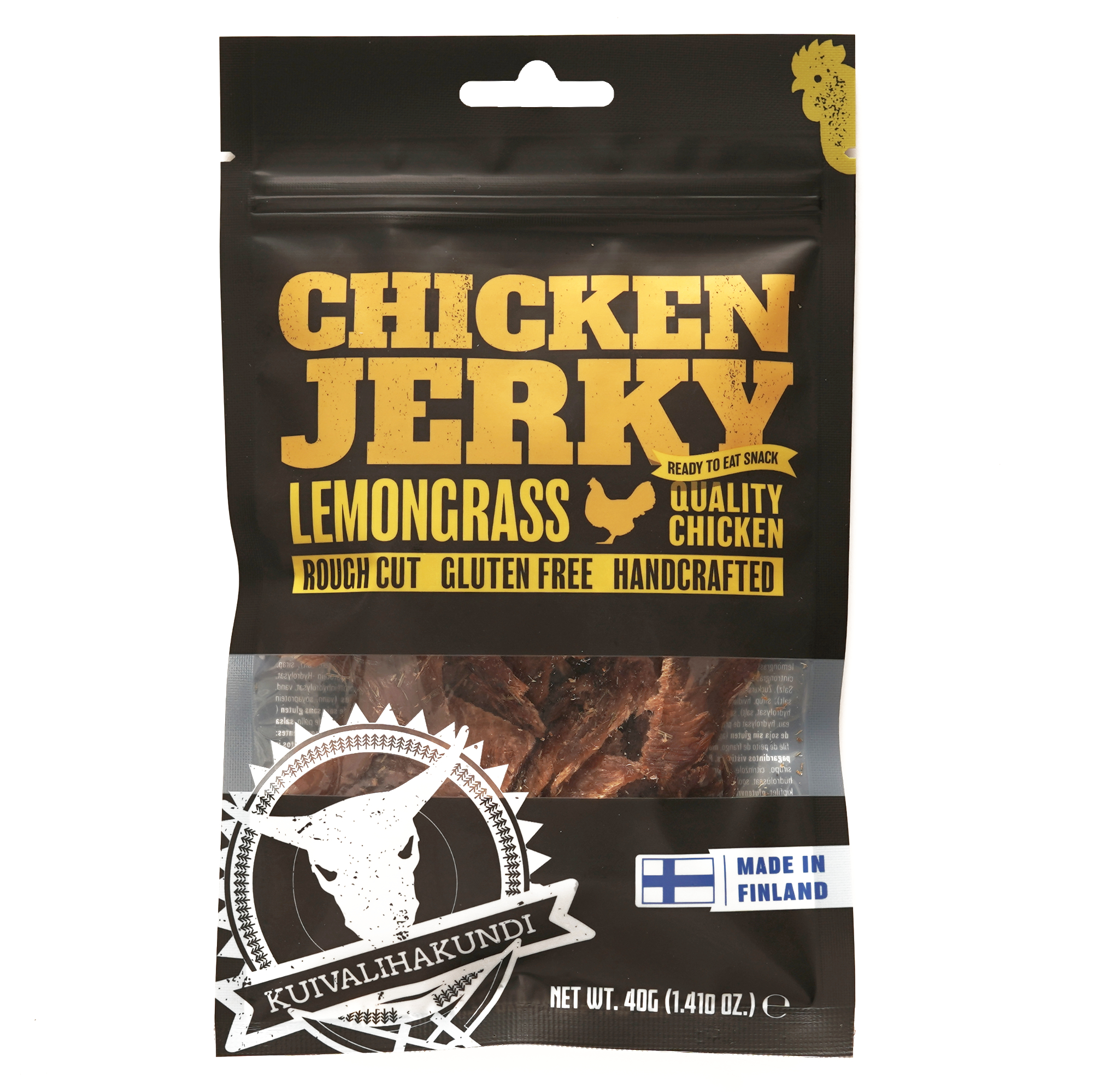 Kuivalihakundi Chicken Jerky Lemongrass Trockenfleisch ist ein proteinreicher Hähnchen-Jerky, gewürzt mit Zitronengras. Probieren Sie etwas, das in Finnland noch nie hergestellt wurde! Ja! Auch aus Hähnchen kann man Trockenfleisch machen! In den von Kuivalihakundi hergestellten Produkten wird nur heimisches Fleisch verwendet.