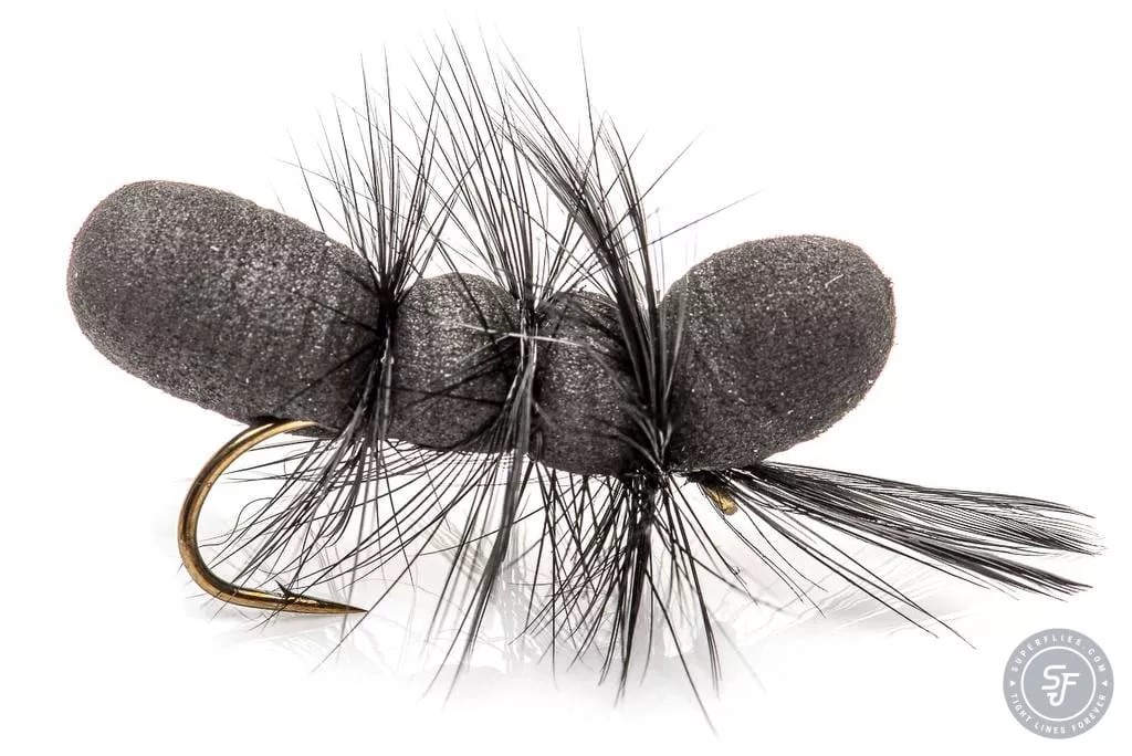 Pupu Tupuna Black -Lachsoberflächenfliege ist eine der bedeutendsten Fliegeninnovationen der letzten Jahre und hat unter Fliegenfischern große Beliebtheit erlangt. Diese Fliege ist eine ausgezeichnete Wahl für das Trockenfliegenfischen in den nördlichen Flüssen.