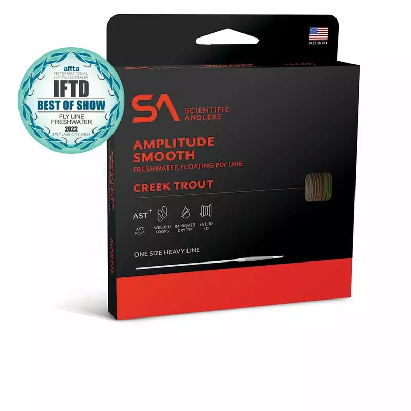 Scientific Anglers Amplitude Smooth Creek Trout schwimmende Fliegenschnur, die speziell für kleine Bäche entwickelt wurde, in denen herkömmliche gewichtete Schnüre nicht optimal funktionieren. Die kurze und rückgewichtete Konizität der Schnur sowie der verlängerte Handhabungsbereich ermöglichen das Wenden von gewichteten Fliegen und effektive Rollwürfe.