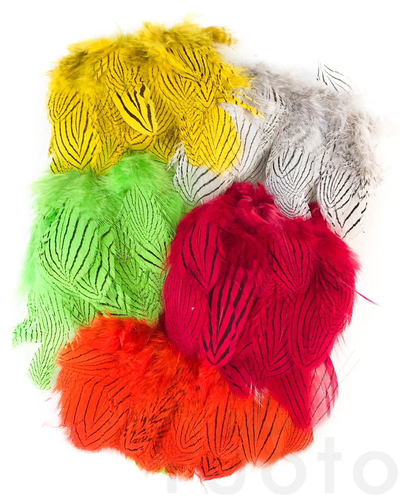 Hareline Silver Pheasant Body Feathers - Silberfasanen-Körperfedern werden hauptsächlich für die Wangen klassischer Streamer verwendet. Sie können jedoch auch als Ersatz für den Hahnhechel bei Lachsfliegen verwendet werden, da der Silberfasan als Hechel ein sehr lebendiges Material ist und die schwarzen Streifen ihm ein natürlicheres Aussehen verleihen. Aufgrund der langen Borsten eignet sich der Silberfasan auch hervorragend als Hechel für Tubenfliegen und beispielsweise als Schwanz für Nymphen und Trockenfliegen.