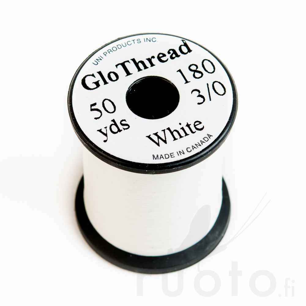 UNI-GloThread 3/0 ist ein phosphoreszierendes Fliegenbindegarn, das im Dunkeln leuchtet. Das Garn ist mit Phosphorpigmenten hergestellt und kann mit Licht aufgeladen werden, wie z.B. mit einem Kamerablitz oder einer Taschenlampe. Nach dem Aufladen leuchtet das Garn im Dunkeln für einige Stunden.