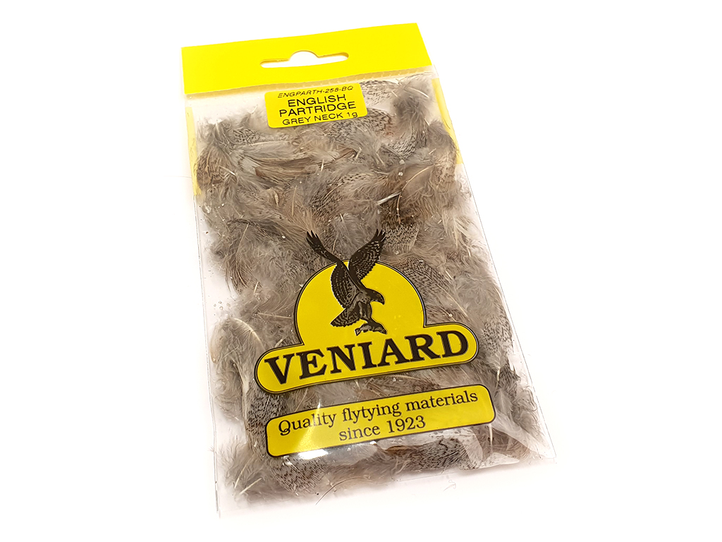 Veniard Partridge Grey Neck sind hellgraue Nackenfedern des Rebhuhns, die sich für die Hecheln und Flügel von Nassfliegen eignen. Weiches Material, das im Wasser schön lebt und dessen Flecken die Lebendigkeit betonen. Effektive Spider-Fliegen werden aus Rebhuhnhecheln hergestellt und funktionieren auch hervorragend bei kleineren Lachsfliegen.