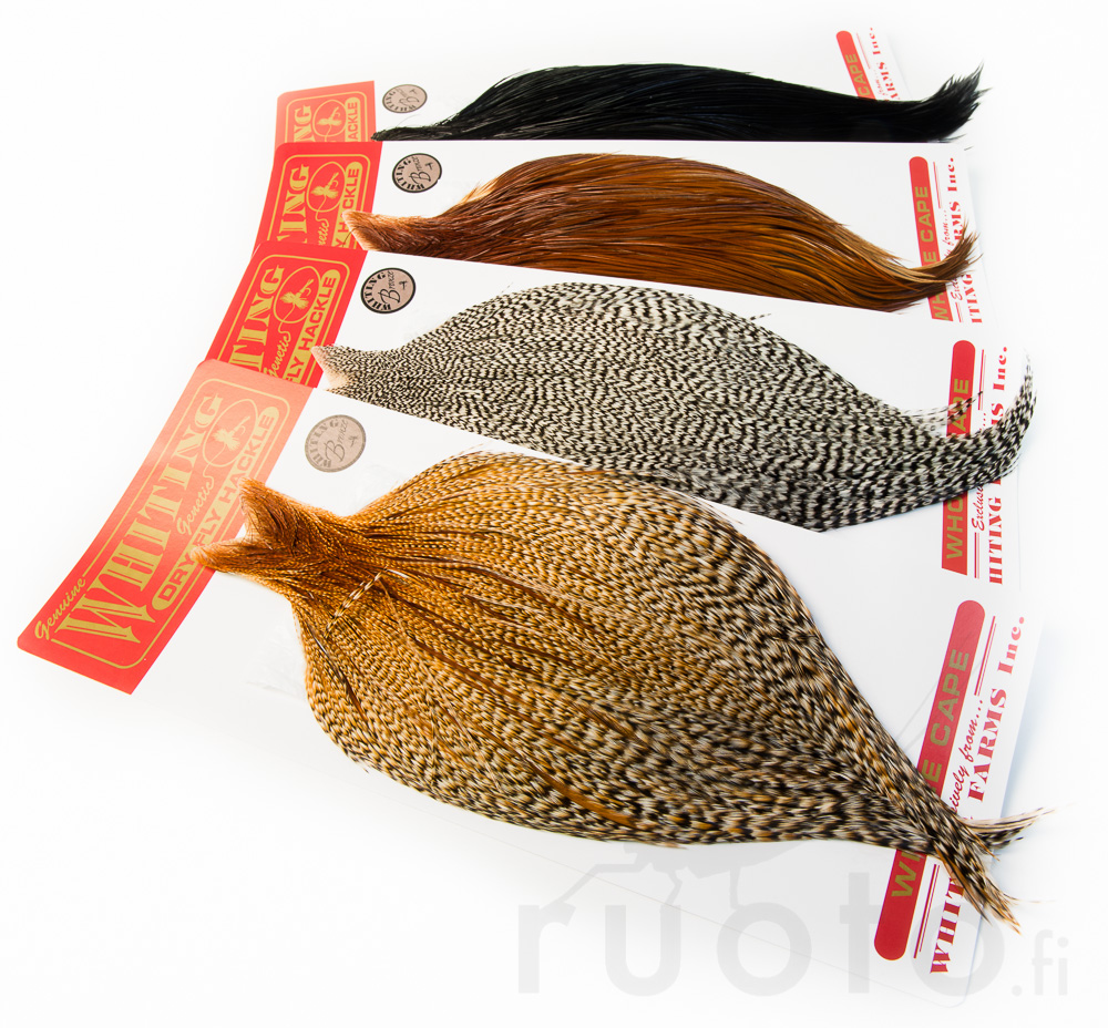 Whiting Dry Fly Cape Bronze Grade Hahnenhälse sind hochwertige Trockenfliegenhälse, deren Federn einen flexiblen und haltbaren Kiel haben. Die Federborsten sind wasserabweisend, sodass mehrere Leerwürfe nicht erforderlich sind und die Fliege schnell trocknet. Der Bronze-Grade-Hals hat Federn für Fliegen der Größen 10-16.