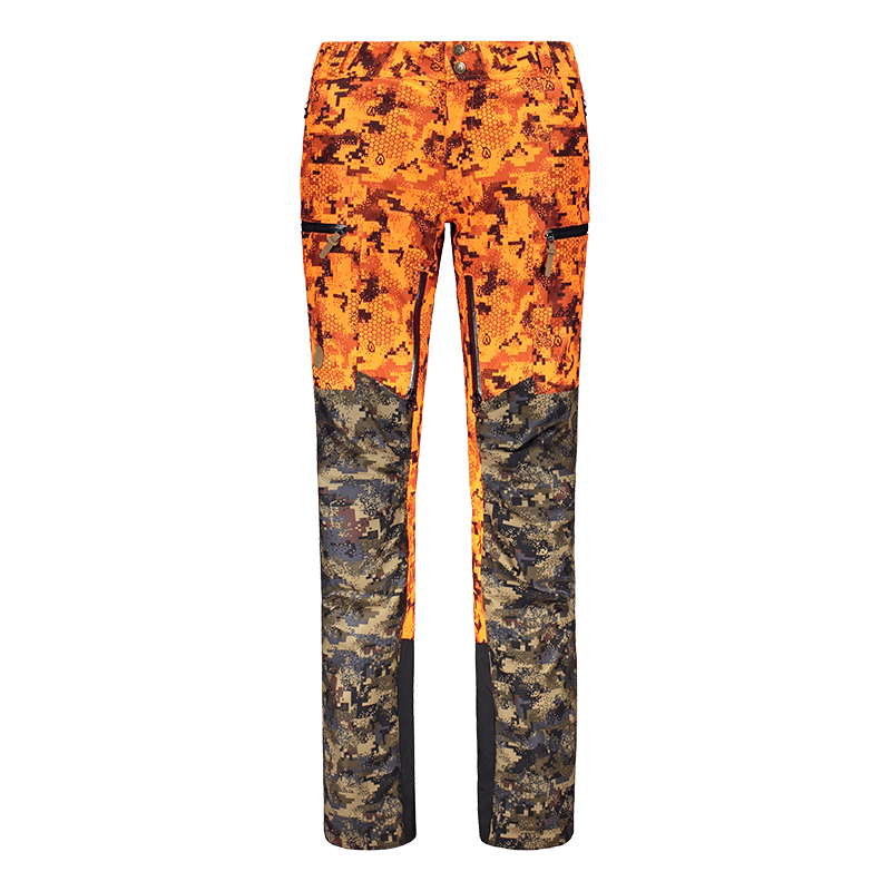 Anar Hirvas W's Jagdhose ist das Ergebnis der Zusammenarbeit eines finnischen Top-Designers und eines erfahrenen Mustermachers, die keine Wünsche offen lässt! Die Jagdhose ist für die finnische Elch- und Hirschjagd konzipiert. Das Obermaterial besteht aus extrem leise gebürstetem und strapazierfähigem Polyester. Die Farbe und das Muster sind so gestaltet, dass sie den Jäger vor dem Sehvermögen der Tiere tarnen. Die leuchtend orange Farbe erfüllt die neuesten gesetzlichen Anforderungen. Diese Eigenschaften eignen sich sowohl für die Ansitz- als auch für die Pirschjagd hervorragend.