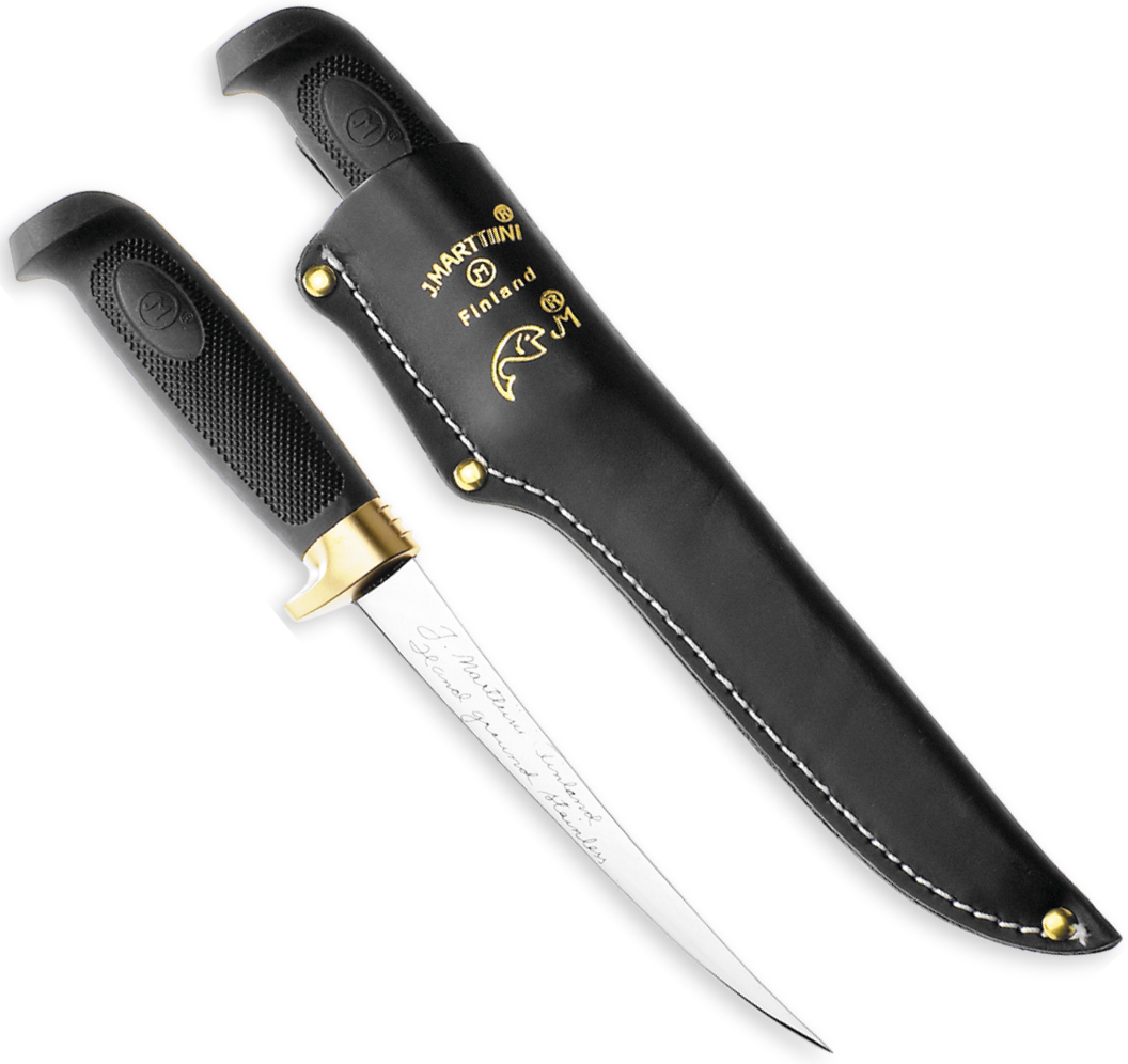 Marttiini Condor Filetiermesser 6" -Serie mit patentierter Struktur, gekennzeichnet durch einen geriffelten Gummigriff und einen Fingerschutz, gewährleistet einen sicheren Halt des Messers auch unter schwierigen Bedingungen. Mit der hochglanzpolierten, scharfen und flexiblen Klinge aus rostfreiem Chromstahl lassen sich mühelos schöne Filets herstellen. Die etwa 15 cm lange Klinge eignet sich am besten für die Verarbeitung von Fischen mit einem Gewicht von etwa 1 kg. Auch viele andere Küchenarbeiten, wie z.B. das Schneiden von Tomaten, lassen sich mit diesem Messer problemlos erledigen. Das Messer wird mit einer schwarzen Lederscheide geliefert.