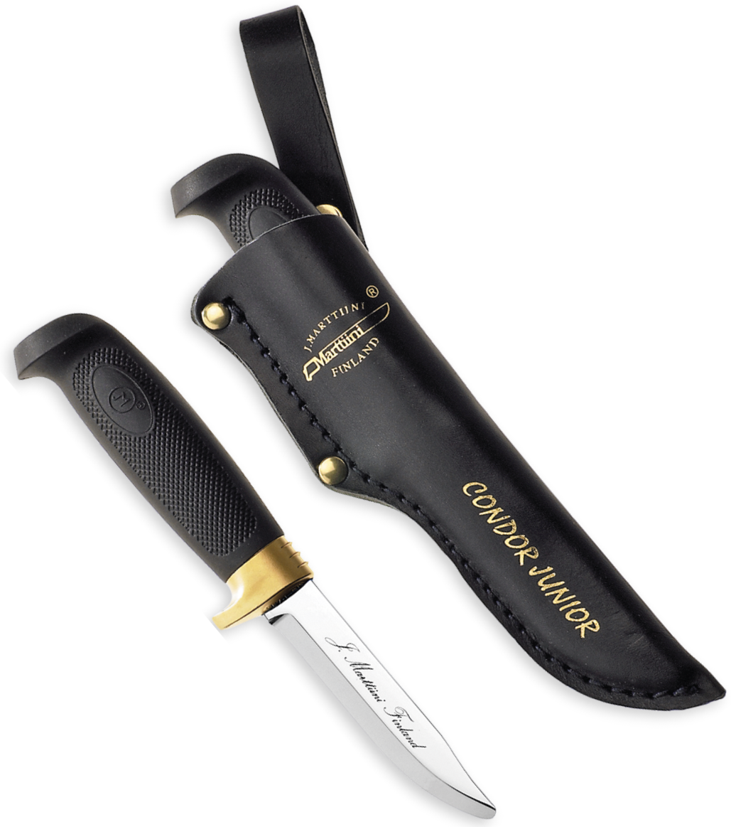 Marttiini Condor Junior -Messer hat einen geriffelten Gummigriff und einen Fingerschutz, die einen festen Halt am Messer gewährleisten. Der Griff ist auch in der Größe für die Hand eines Kindes geeignet. Und zu einem richtigen Messer gehört natürlich auch eine richtige Lederscheide.
