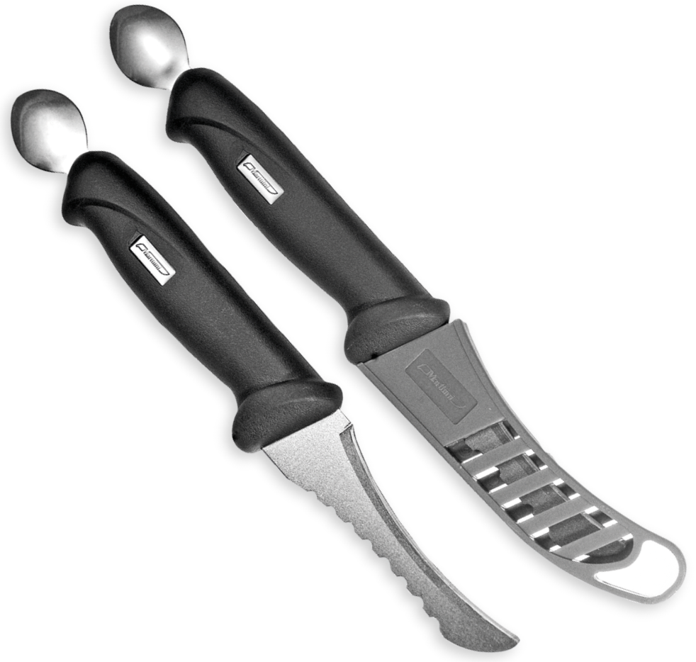 Marttiini Fish Cleaner - Fischreiniger. Der Alleskönner für die Fischverarbeitung. Der Fischreiniger ist, wie der Name schon sagt, ein praktisches Werkzeug zum Ausnehmen von Fischen. Mit der gebogenen Klinge lässt sich der Fisch leicht öffnen und mit der Zahnung ist das Schuppen einfach und bequem. Mit dem Metalllöffel am Griffende ist das Entfernen der Innereien sauber und schnell. Die Klinge wird durch eine Kunststoffscheide geschützt.