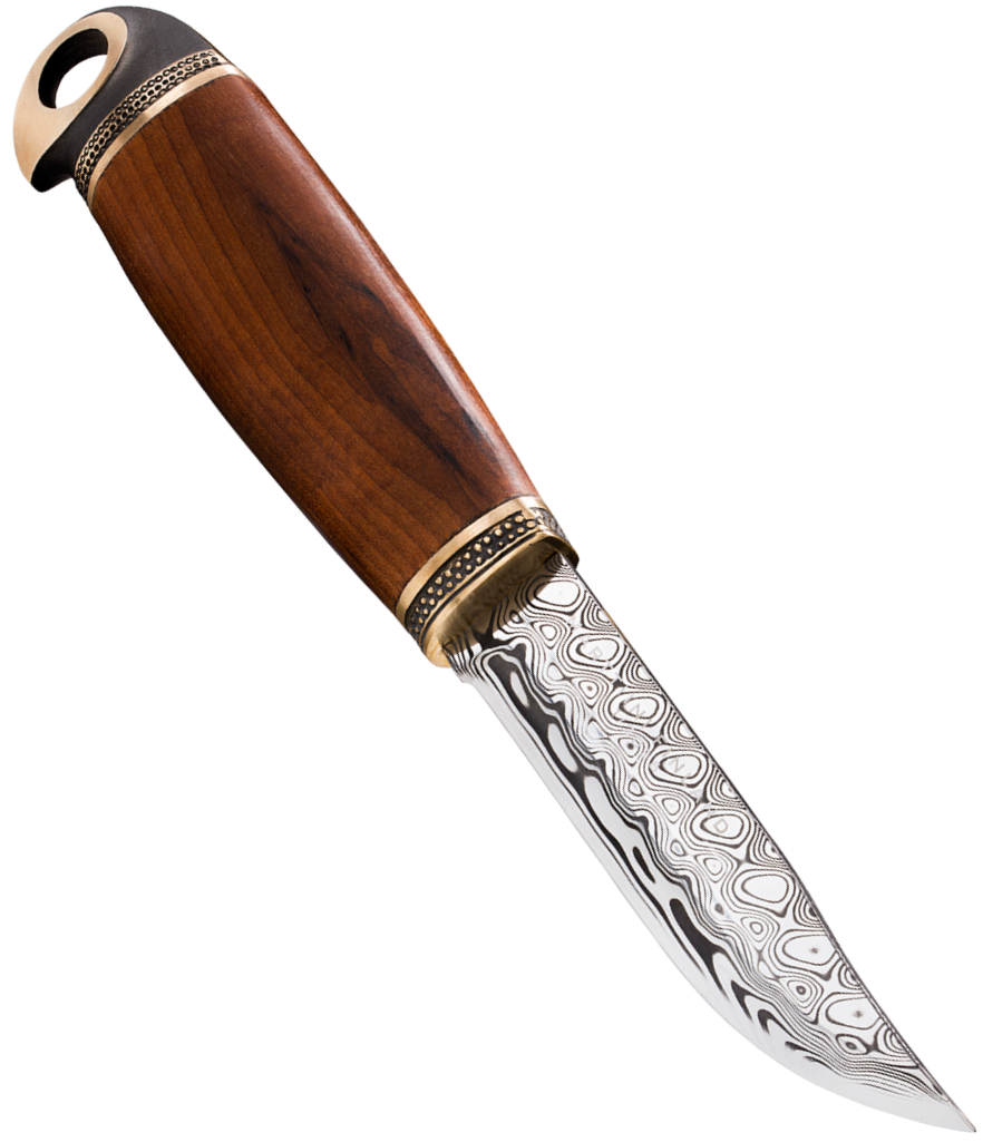 Marttiini Kotka Damascus - Im Kotka Damascus-Messer mit Bronzebeschlägen vereinen sich der klassische Marttiini-Griff mit bronzenem Adlerbeschlag und die wunderschön gemusterte Damastklinge. Die Klinge des Messers besteht aus rostfreiem Stahl, bei dem zwei verschiedene Stahlmaterialien mit moderner Technik nahtlos zu 120 Schichten kombiniert wurden. Der Wechsel der beiden Stahlmaterialien bildet das schöne Muster der Klinge.