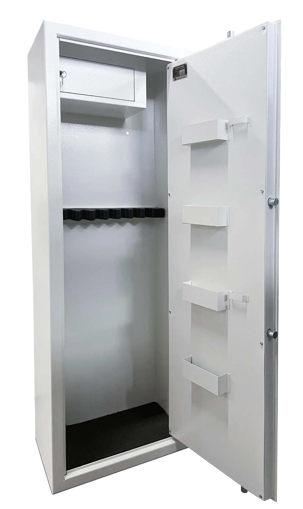 Suomi RS8 Waffenschrank ist ein nach dem neuen Waffengesetz zertifizierter schwerer Waffenschrank und eignet sich zur Aufbewahrung von maximal 8 Waffen. Der Waffenschrank wurde gemäß der anspruchsvollen Norm EN-14450:2006 S1 getestet und besteht aus äußerst robustem 3 mm Stahl. Zur Verriegelung wird ein einbruchsicheres Bolzenschloss sowie das Kaba Mauer 71111 Sicherheitsschloss verwendet. Ein abschließbares oberes Regal und geräumige offene Regale in der Tür zur Aufbewahrung von Gegenständen und Patronen. Der Schrank kann bei Bedarf auch durch die vorbereiteten Befestigungslöcher am Boden oder an der Wand befestigt werden.