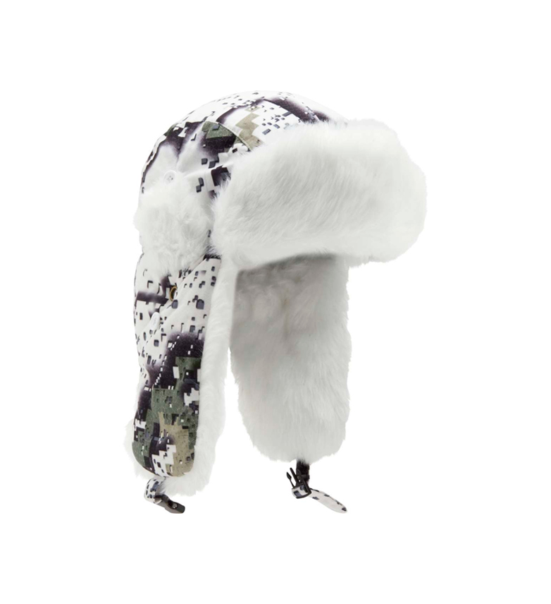 Swedteam Ridge Thermo Pilot Hat Zero Warme Fliegermütze, die innen mit weichem und warmem Kunstpelz gefüttert ist. Außenseite im weißen Desolve Zero -Tarnmuster. Klappen mit Befestigungsriemen, um die Klappen unter dem Kinn oder oben am Kopf zu verbinden, wenn man die Klappen oben halten möchte. Material komplett aus Polyester.