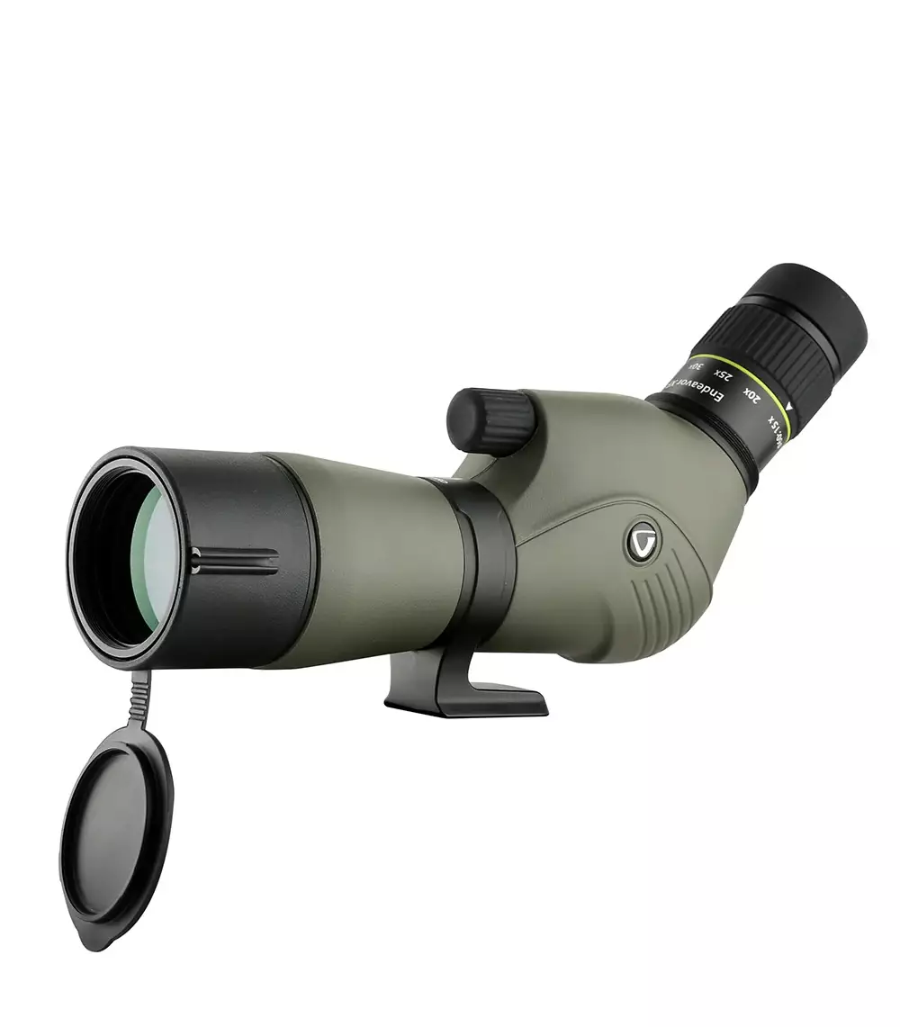 Dieses Spektiv ist mit einem 60-mm-Objektiv und einem angewinkelten Okular ausgestattet, das eine Vergrößerung von 15–45x bietet. Die Linsen sind vollständig mehrfachvergütet und verfügen über ein phasenvergütetes BaK4-Dachprismensystem, das die Bildqualität weiter verbessert. Das Spektiv verfügt außerdem über eine integrierte Sonnenblende, die Blendung bei hellem Sonnenlicht reduziert.