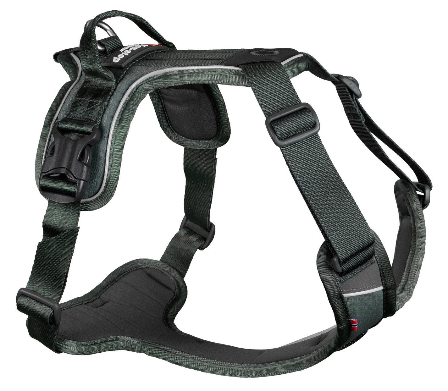 Zusätzlich zum Befestigungspunkt auf dem Rücken gibt es eine Schlaufe unter dem Bauch zum Anbringen einer Schleppleine. Vorne gibt es einen dritten Befestigungspunkt, mit dem der Hund sanft daran gewöhnt werden kann, nicht zu ziehen. Auf dem Rücken des Geschirrs befindet sich ein Griff für bessere Kontrolle. Der Griff kann auch verwendet werden, um dem Hund zu helfen, Hindernisse auf dem Weg zu überwinden.