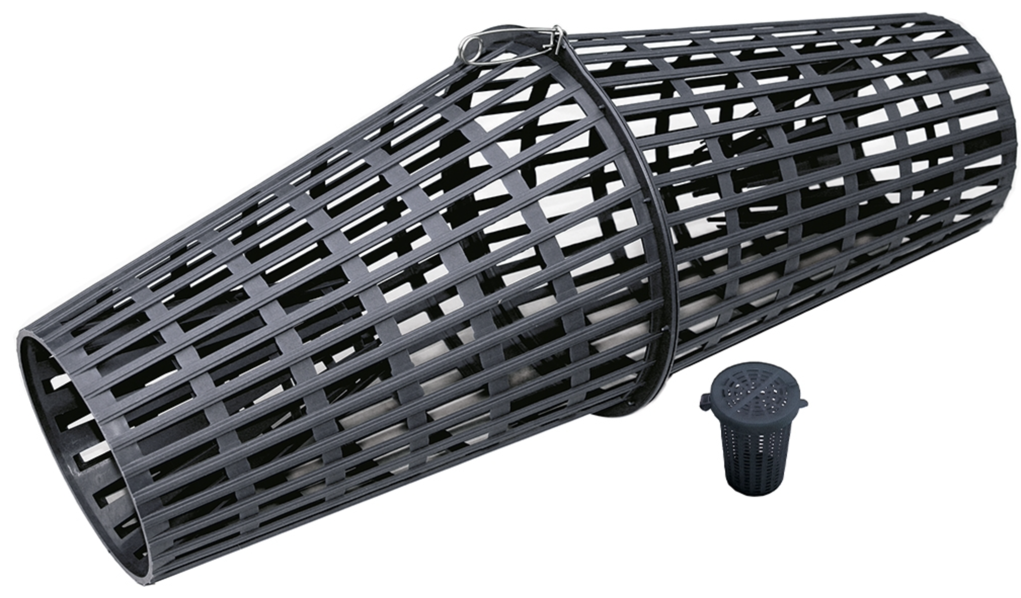 Ahti Krebsreuse - aus der es für den Krebs schwer ist zu entkommen. Enthält einen verschließbaren Köderbehälter aus Kunststoff. Das Gewicht am unteren Teil der Reuse dreht sie gegen den Boden. Die in der Mitte aufklappbare Reuse wird mit einem Schnellverschluss aus Edelstahl verriegelt.