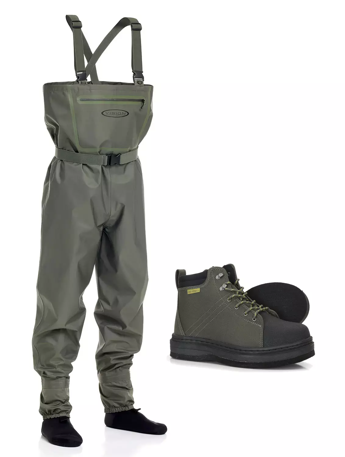 Vision Rio Vanda und Rio Vanda Felt Bundle – ein umfassendes Wading-Paket, das die bequemen und langlebigen Rio Vanda Wathosen mit den Rio Vanda Watschuhen mit Filzsohle kombiniert. Diese Kombination wurde entwickelt, um Anglern und Watenden hervorragenden Komfort und Leistung zu bieten.