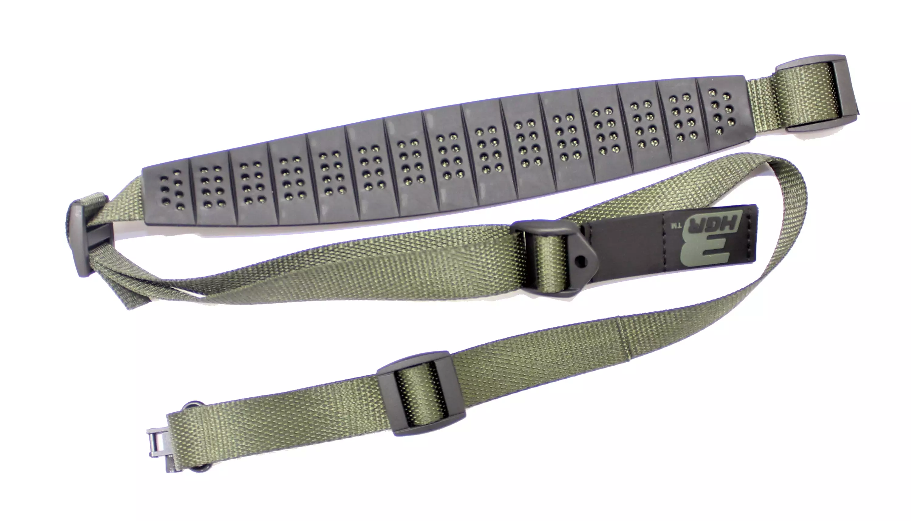 3HGR Overberget Gewehrriemen ist ein "Bulkriemen", der auf Wunsch des Publikums hergestellt wurde und neben einem rutschfesten Schulterpolster einige zusätzliche Funktionen bietet. Dieser in Finnland hergestellte Riemen funktioniert als normaler Trageriemen, aber dank seiner zweiteiligen Konstruktion und der Ladderlock-Schnalle ist eine schnelle Längenverstellung möglich. Der Riemen enthält immer Riemenschlaufen, die jedoch vom Benutzer ausgetauscht werden können. Außerdem kann die unter dem Schulterpolster befindliche Riemenschlaufe als Daumenschlaufe verwendet werden, um die Hand beim Tragen zu entlasten. Wenn der Lauf nach unten getragen wird, kann der Riemen auch als Ching Sling-ähnliche Schießstütze verwendet werden. Diese Funktion ("Overberget-Schlaufe") wurde auf Wunsch des norwegischen Importeurs hinzugefügt.