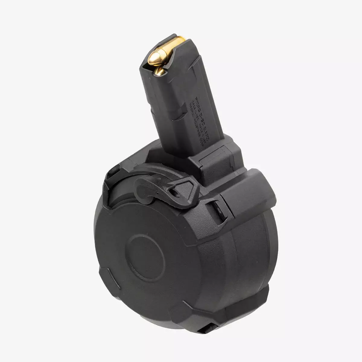Magpul PMAG D-50 GL9 - PCC ist ein 50-Schuss-Trommelmagazin im Kaliber 9x19 mm Parabellum für großformatige Pistolenplattformen und PCC-Waffen, die Magazine im GLOCK-Doppelreihenformat verwenden; nicht kompatibel mit GLOCK-Handfeuerwaffen. Die Trommelkonstruktion bietet eine hohe Kapazität bei kontrollierter Höhe, wodurch das Magazin leicht zu lagern ist. Das Laden wird durch einen Ratschenladehebel erleichtert, der die Feder während des Ladevorgangs entspannt, und die Überwachung der verbleibenden Munition erfolgt durch ein Rückfenster, einen gut sichtbaren Follower und eine Kapazitätsrolle.