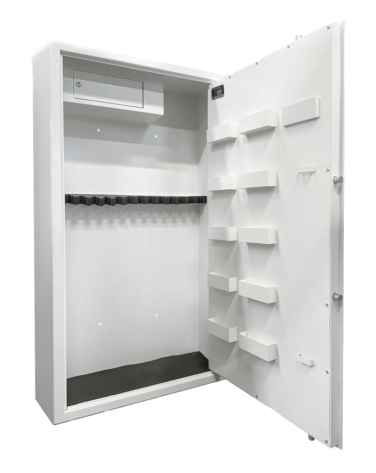 Suomi RS14 Waffenschrank ist ein nach dem neuen Waffengesetz zertifizierter schwerer Waffenschrank und eignet sich zur Aufbewahrung von maximal 14 Waffen. Der Waffenschrank wurde gemäß der anspruchsvollen Norm EN-14450:2006 S1 getestet und besteht aus äußerst robustem 3 mm Stahl. Zur Verriegelung wird ein einbruchsicheres Bolzenschloss sowie das Kaba Mauer 71111 Sicherheitsschloss verwendet.