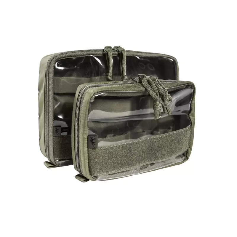 Tasmanian Tiger Medic Pouch Set olive – Diese Erste-Hilfe-Tasche ist für den modularen Einsatz konzipiert und enthält zwei flexible, transparente Taschen in verschiedenen Größen. Die Taschen sind mit Klettverschlüssen ausgestattet, die eine einfache Befestigung und Entfernung ermöglichen.