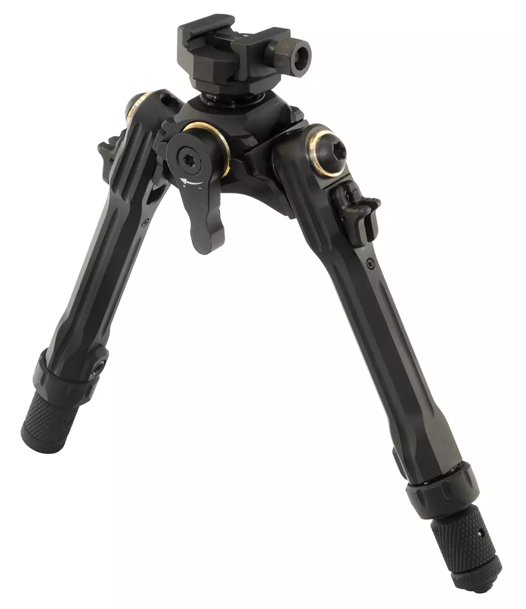 Die Stütze wird an einer flachprofiligen Picatinny-Schiene befestigt und ermöglicht eine 360°-Drehung sowie Neigungen in verschiedene Richtungen. Die Beine sind automatisch einziehbar und haben austauschbare Füße.